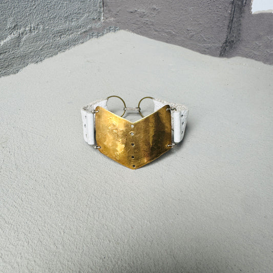 GEOMETRIC BRASS AND WHITE LEATHER BRACELET