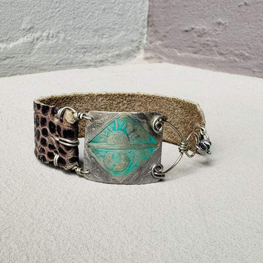 ETCHED SUN AND MOON METAL + LEATHER BRACELET