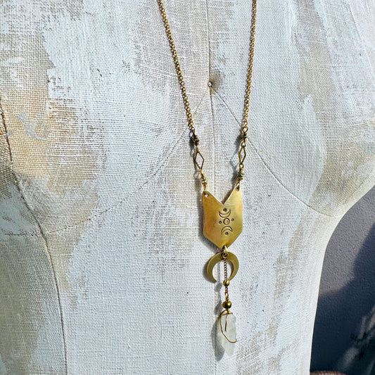 MOON STAMPED BRASS SHIELD WITH QUARTZ NECKLACE