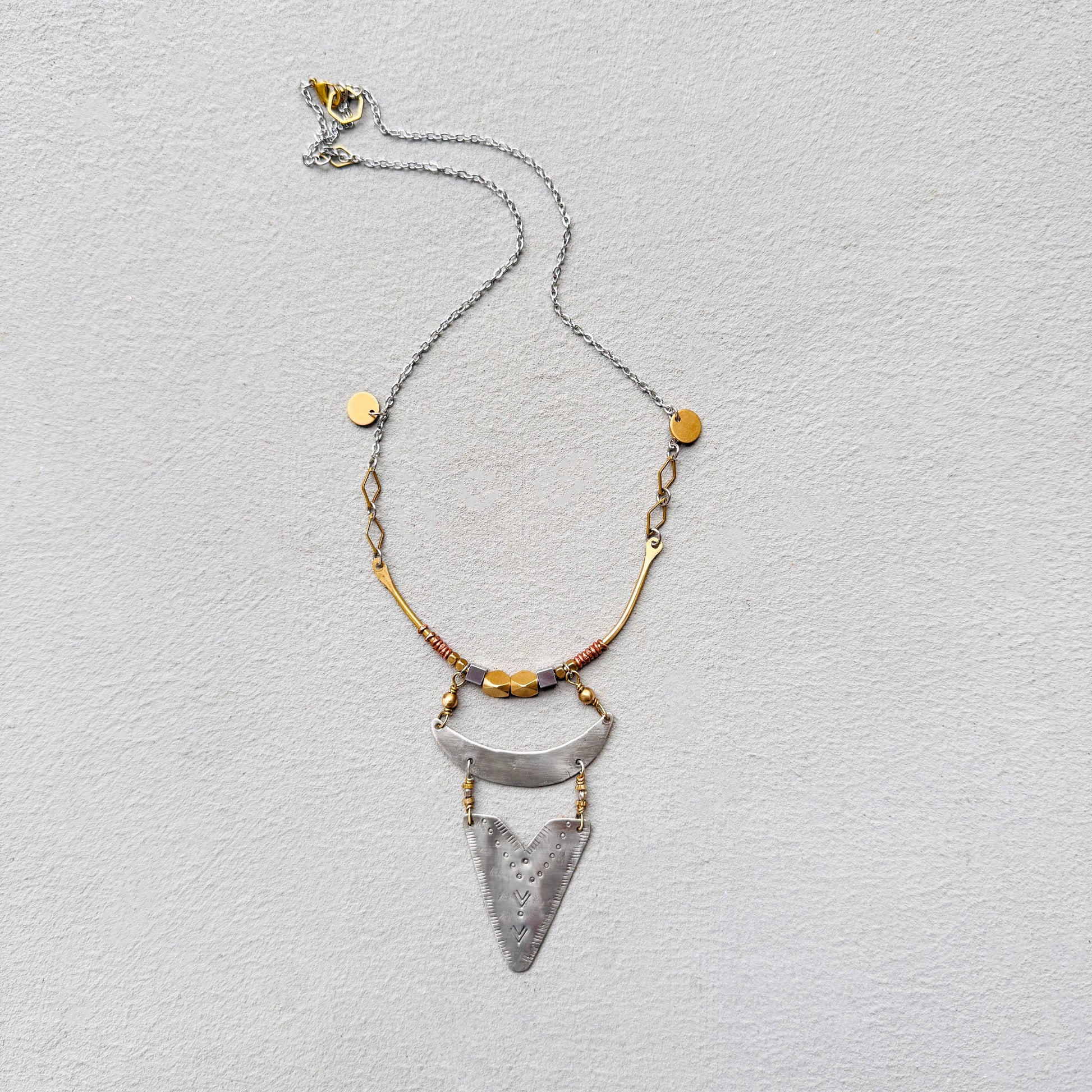 Silver moon and stamped triangle pendant suspended from a beaded thick brass collar. A bold, unique statement piece.