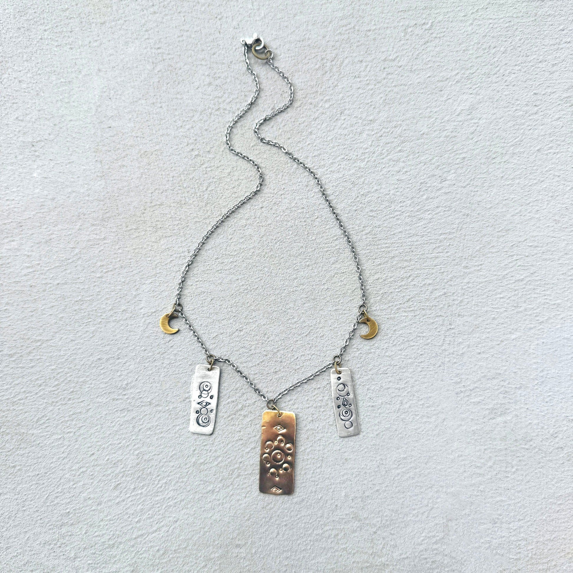 Mixed metal rectangles, stamped with lunar and planetary designs, suspended from a silver chain. Unique, fun design.
