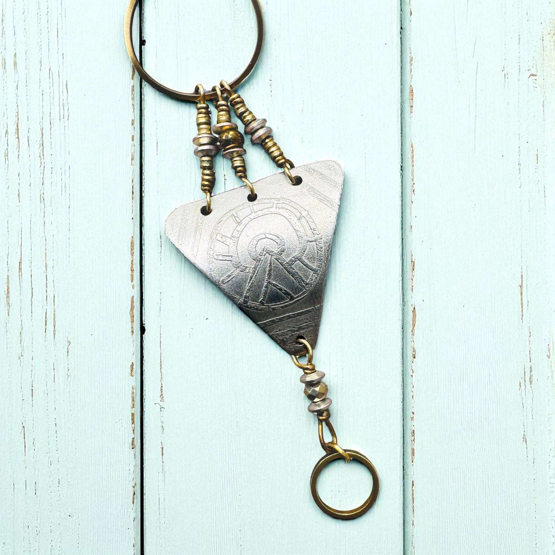 Silver triangle with hand drawn mountain design attached to a metallic silver leather band. It's accented with brass and silver beads and has a brass lobster clasp.
