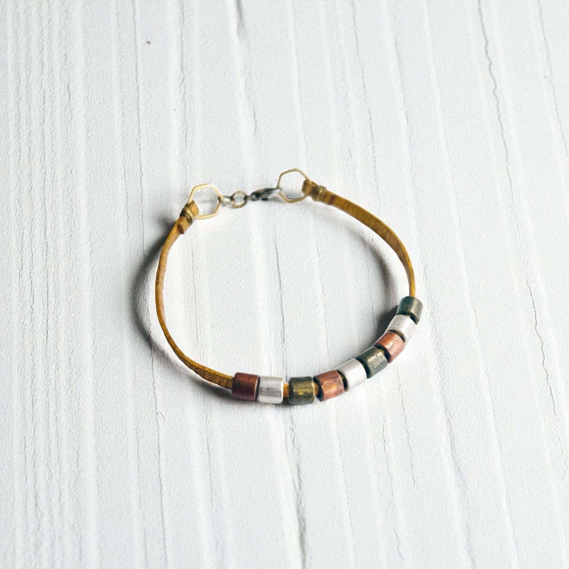 Thin metallic gold leather band accented with mixed metal barrel beads.