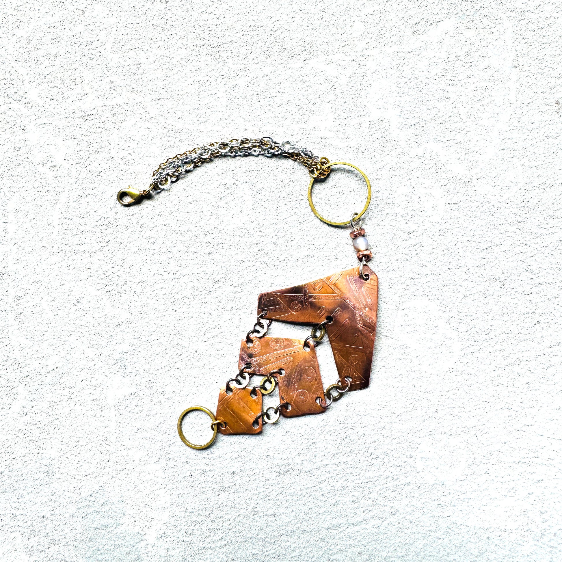 Unique geometric bracelet made from 3 copper pendants. Each piece has a hand drawn, chemically etched tribal pattern. They're connected by small brass hoops and accented with a small agate bead.